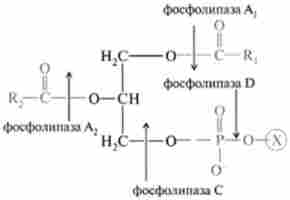 Відомо кілька типів фосфоліпаз. Фосфоліпаза А, гидролизует ефірну зв'язок в положенні 1 гліцерофосфоліпіди, в результаті чого відщеплюється одна молекула жирної кислоти. фосфоліпаза А2 каталізує гидролитичне відщеплення жирної кислоти в положенні 2 гліцерофосфоліпіди, що утворюються при цьому продукти називаються лізофосфоліпіди, так як вони токсичні і викликають лізис мембран клітин. Висока активність фосфоліпази А2 в отруті змій і скорпіонів призводить до того, що при їх укусі відбувається гемоліз еритроцитів. фосфоліпаза А2 підшлункової залози надходить в порожнину тонкого кишечника в неактивній формі і тільки після відщеплення від неї трипсином гептапептид стає активною. Накопичення лізофос- фоліпідов в кишечнику зазвичай не відбувається, оскільки одночасно на гліцерофосфоліпіди діють обидві фосфоліпази: А, і А2. Крім цього, ли- зофосфоліпіди гідролізуються ферментом л ізофосфоліпазой, в результаті дії якого утворюються нетоксичні для організму продукти.