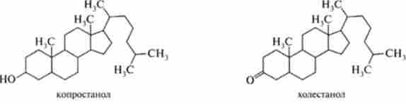 Щодня з організму людини виводиться близько I г холестеролу. Приблизно половина цієї кількості піддається мікробному відновленню в нижньому відділі кишечника до копростанола і холестанол: