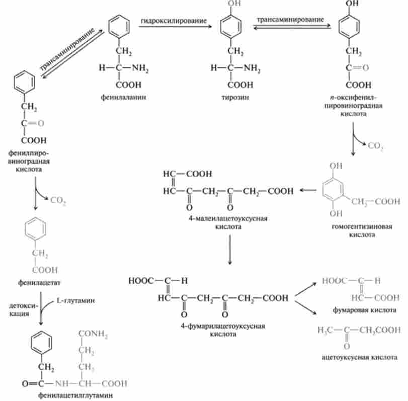 Розпад тирозину починається з трансаминирования, що приводить до утворення л-оксіфенілпіровіноградной кислоти. Остання при дії ферменту оксидази л-оксіфенілпіровіноградной кислоти (медьсодержащий білок) каталізує перетворення свого субстрату в гомогентизинової кислоту, причому реакція ця включає в себе декарбоксилирование, окислення, гідроксилювання ароматичного ядра і міграцію бічного ланцюга. Оксілаза гомогентизиновой кислоти - фермент, який потребує іони двовалентного заліза, каталізує утворення з гомогентизиновой кислоти малеілаіе- тоуксусной кислоти. Остання перетворюється в відповідне транссосді- ня - фумарілацетоуксусную кислоту, розщеплення якої призводить до утворення, по-перше, фумарової кислоти, яка піддається подальшим перетворенням за участю ферментів циклу ТКК, і, по-друге, ацето- оцтової кислоти, яка може або увійти також в цикл ТКК (у формі ацетил-КоА), або перетворитися в жирні кислоти.
