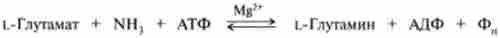 Важливою реакцією, яка призводить до включення аміаку в органічні сполуки, є також АТФ-залежне утворення глутаміну під дією глутамінсінтетази: