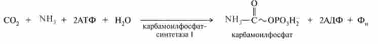 Нарешті, велике значення має реакція, що каталізується карбамоіл- фосфатсінтстазой, яка веде до включення аміаку в деякі биосинтетичні продукти, наприклад в піримідинів (гл. 26) і сечовину (24.7.1). Стехиометрія цієї реакції описується рівнянням