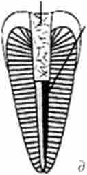 а - сіллером, основний гутаперчева штифт з міткою робочої довжини, спредер відтіснив основний штифт; б - паста, витіснення повітря з кореневого каналу зворотно-поступальними рухами основного штифта; в - ендо- герметик, основний штифт зміщений спредером; г - ендогерметік, основний і введення додаткового штифта; д - кореневої канал пломбувати двома гутаперчевими штифтами, пломба