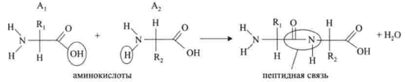 Білки утворяться в результаті послідовних реакцій конденсації амінокислот. Спочатку реагують дві амінокислоти (Ai і А2) І утворюється дипептид