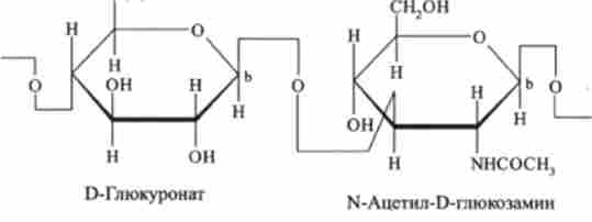 Гіалуронова кислота - це глікозаміноглікан міжклітинної основної речовини тканин тварин, вона виявлена в підшкірному шарі і склоподібному тілі. Складається з повторюваних одиниць дисахарида, в якому D-глюкуронової кислоти утворює з N-ацетил-О-глюкозаміном гликозидні зв'язку: