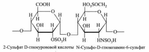 Гепарин утворюється лише в клітинах, присутніх в вистилає шарі стінок артерій. До його складу входять повторювані одиниці із залишків шести цукрів, кожна з яких представляє собою послідовність чергуються залишків сульфопроізводние М-ацетил-Е-глюкозаміну і D-ідуроната. Він містить велику кількість сульфатів.