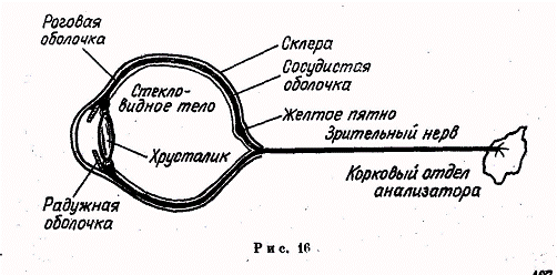 У процесі людської діяльності відбувається пізнання навколишнього світу, тобто його відображення. Яким же чином відбувається відображення мозком навколишнього світу? Мозок безперервно отримує сигнали про те, що про виходить в навколишньої дійсності і всередині самого організму, відомості про предмети та явища навколишнього середовища та про стан внутрішніх органів тіла. Предмети і явища відрізняються різними властивостями, якостями, і відображення мозком цих предметів і явищ неможливо без відображення їх властивостей і якостей. Найпростіший пізнавальний психічний процес - відчуття. Відчуття - це відображення в корі головного мозку окремих властивостей предметів і явищ навколишнього світу, впливають в даний момент на мозок людини. За допомогою відчуттів ми пізнаємо величину, форму, колір, щільність, температуру, запах і смак навколишніх предметів, знайомимося з виробленими ними звуками. Відчуття дають матеріал для інших, більш складних психічних процесів - сприйняття мислення, уяви. В. І. Ленін зазначав: «... матерія, діючи на наші органи чуття, виробляє відчуття» «Інакше, як через відчуття, ми ні про яких формах речовини і ні про яких формах руху Нічого дізнатися не можемо ... ». Це означає, що відчуття-результат впливу оточуючого нас матеріального світу на наш мозок через спеціальні нервові апарати, про які мова буде йти нижче. Відчуття - початковий джерело всіх наших знань про навколишній світ. І дійсно, люди сліпі від народження, ніколи не зможуть осягнути, що таке червоний або зелений колір, глухі від народження - що таке звук людського голосу, спів птахів, шум водоспаду або чарівна мелодія скрипки. Якби людина була позбавлена всіх відчуттів, він ніякими способами не міг би пізнавати навколишній світ і розуміти, що відбувається навколо. Відчуття властиві і тваринам. Причому деякі тварини мають значно більш гострим зором (наприклад, орли), ніж людина, більш тонким нюхом і слухом (собака). Очі мурах розрізняють ультрафіолетові промені, недоступні оці людини. Кажани і дельфіни розрізняють ультра звуки, яких не чує людина. Гримуча змія відчуває нікчемні коливання температури - в 0,001 градуса. Але око і вухо людини розрізняють в речах значно більше, ніж око орла або вухо собаки, так як відчуття людини збагачуються його мисленням. Виникає питання: наскільки правильно мозок відбиває властивості і якості предметів об'єктивного світу? Вся людська історія, багатовікова практика людини доводить, що мозок людини правильно і точно відображає ці властивості. Інакше кажучи, відчуття є відображення реально існуючих властивостей предметів і явищ. § 2. Аналізатори як органи відчуттів Яким же чином інформація (сигнали, які мають певні відомості) із зовнішнього світу надходить у мозок? Адже мозок, як ми знаємо, захищений міцною кісткової оболонкою черепа, ізольований від навколишнього середовища. Мозок не вступає в безпосередній контакт з навколишнім світом, який внаслідок цього не може безпосередньо впливати на мозок. Як же мозок повідомляється із зовнішнім світом? Існують спеціальні канали зв'язку мозку з зовнішнім світом, за якими в мозок по ступає різноманітна інформація. І. П. Павлов назвав їх аналізаторами. Малюнок Аналізатор - складний нервовий механізм, який виробляє тонкий аналіз навколишнього світу, тобто виділяє окремі його елем