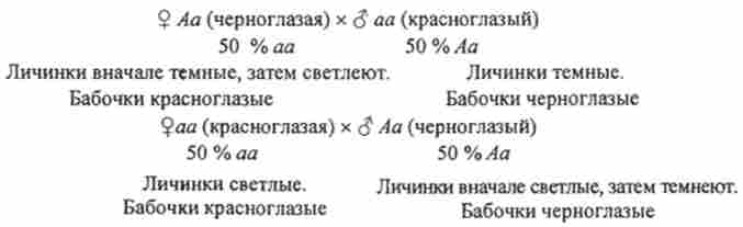 Аналогічне явище спостерігається при спадкуванні пігментації оболонки яйця у шовкопряда, а також зміні поколінь без діапаузи. Обидва ці ознаки визначаються властивостями цитоплазми яйця, які формуються до запліднення під контролем генотипу матері. Так само визначається пігментація очей і деяких тканин у личинок метелика - млинової вогнівки {ЕркевНа кіІтеІа). Слід зазначити, що в останньому випадку материнський ефект поступово згасає в онтогенезі.