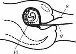 1 - амніотична рідина, 2 - плацента, 3 - матка, 4 - лобкової зрощення, 5 - піхву, б - шийка, 7 - крижі, 8 - дзеркало, 9 - канюля, 10 - хоріон