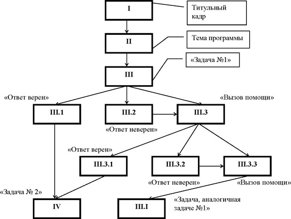 Розглянемо приклад розробки фрагмента навчальної програми з математики на закріплення навичок вирішення завдань на рух. Визначимо мети даної програми. З педагогічного досвіду відомо, що вчителю не вистачає часу для індивідуальної роботи з кожним учнем і проведення контролю. Можна провести самостійну роботу по даній темі, але учень вирішує завдання не тільки для того, щоб знайти рішення. Його мета - навчитися вирішувати, навчитися будувати логічний ланцюжок умовиводів, що приводить до вірного рішення. І в цьому може допомогти вчителю грамотно складена навчальна програма. Можна спланувати вивчення даної теми таким чином: на першому уроці традиційним способом провести виклад нового матеріалу і первинне його закріплення. Наступний урок можна спланувати в комп'ютерному класі з використанням даного ППС. Отже, метою ППС буде закріплення знань і відпрацьовано-ботка навичок вирішення завдань на рух. На третьому уроці можна провести самостійну роботу для перевірки рівня засвоєння матеріалу. Для складання педагогічного сценарію необхідно підібрати завдання і класифікувати їх за ступенем складності. Пред'явлення завдань необхідно починати з більш легких. При вирішенні завдання для учня можна спланувати три варіанти виходу: задача вирішена вірно, задача вирішена невірно, для вирішення завдання потрібна допомога. Залежно від складності завдання можна передбачити ступінчасту допомогу, яка поетапно розкриває рішення задачі. Розглянемо фрагмент такої програми. Алгоритм зміни кадрів можна представити графом (мал.31). На графі наочно представлена схема двоступеневої допомоги. У разі, якщо реалізована і друга допомогу (кадр III.3.3), тоді для подальшого вирішення пропонується не нова задача, а аналогічна першою для закріплення навичок. На малюнку 31 використані такі умовні позначення: позначення окремих кадрів (цифрами позначені номери кадрів); позначення напрямку переходів між слайдами . Рис. 31. Приклад ілюстрації переходів між слайдами за допомогою графа Відповідно до графом складемо педагогічний сценарій: Тип і номер кадру Інформаційний I НАВЧАЛЬНА ПРОГРАМА З МАТЕМАТИКИ Напрямок переходу Кадр II Тип і номер кадру Інформаційний II РІШЕННЯ ЗАДАЧ НА РУХ Напрямок переходу Кадр III Тип і номер кадру Інформаційний III Завдання № 1 Поїзд за 8 год пройшов 432 км. Потім він збільшив швидкість на 4 км / год і інше відстань пройшов за 6 ч. Скільки всього кілометрів пройшов поїзд? Виріши завдання в зошиті і вибери варіант відповіді: 58348780764 При скруті виклич допомога? Напрямок переходу Якщо відповідь вірний, то кадр III. 1 Якщо відповідь невірний, то кадр III.2 Якщо викликана допомога, то III. 3 Тип і номер кадру Оцінюючий III. 1 РІШЕННЯ Г продовжимо ІРАВІЛЬНОЕ ІМ РОБОТУ Напрямок переходу Нове завдання кадр IV Тип і номер кадру Оцінюючий III. 2 ДОПУЩЕЬ ПОДИВИСЯ [А ПОМИЛКА ПОДСКАЗКУ Напрямок переходу Виклик допомоги кадр III. 3 Так як відомо, що поїзд за 8 год пройшов 432 км, то його швидкість на цій ділянці дорівнює 432: 8 = 54 (км / год) Продовжуй рішення самостійно і вибери варіант відповіді: 58348780764 При скруті виклич допомога? Напрямок переходу Якщо відповідь вірний, то кадр III.3.1 Якщо відповідь невірний, то кадр III.3.2 Якщо викликана допомога, то III.3.3 Тип і номер кадру Оцінюючий III.3.1 ВІДПОВІДЬ продовжимо вірний! ІМ РОБОТУ Напрямок переходу Нове завдання кадр IV Тип і номер кадру Оціню