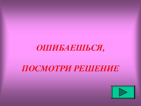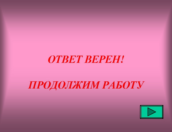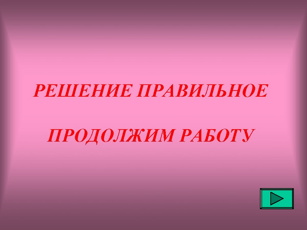 Технологія оформлення та компонування слайда № 6 (кадр III.3) аналогічна оформлення слайда № 3. Дія керуючих кнопок з невірними відповідями налаштоване на перехід до слайду № 8 (кадр III.3.2). Кнопка з вірною відповіддю викликає на екран слайд № 7 (кадр III.3.1). При виклику допомоги управління передається слайду № 9 (кадр ІІІ.3.3) Слайди № 7, № 8 та № 9 структурно не відрізняються від слайдів № 4 та № 5. Дія керуючої кнопки на слайді № 7 викликає на екран слайд з текстом нового завдання. Кнопка переходу слайда № 8 визначає появу на екрані кадру з ілюстрацією вирішення першого завдання. Кнопка "Далі" на слайді № 9 здійснює перехід на слайд з текстом аналогічної задачі. Наступні слайди для даної програми створюються і оформляються на основі вже розглянутих слайдів. Слайд № 7 (кадр ІІІ.З.1)