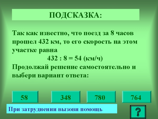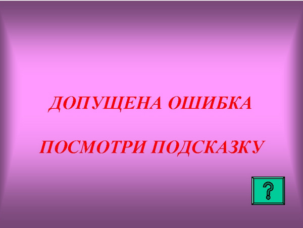 Зовнішнє оформлення слайдів № 4 та № 5 виконано так само, як і для слайдів № 1 та № 2. Ці слайди мають по одній керуючої кнопці. Слайд № 4 містить кнопку переходу І «Далі», яка запрограмована на перехід до слайда з текстом наступного завдання (по графу це кадр IV). Слайд № 5 забезпечений кнопкою обов'язкового виклику допомоги |? |, Яка представлена на слайді № 6 (кадр ІІІ.З). Слайд № 6 (кадр ІІІ.З)