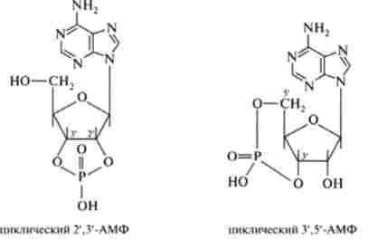 Циклічні нуклеотиди 3 ', 5'-аденозинмонофосфат (цАМФ) і 3', 5'-гуано- зінмонофосфат (цГМФ) є внутрішньоклітинними посередниками різних позаклітинних сигналів (гормонів, нейромедіаторів і т. Д.). Вони утворюються під дією ферментів (циклази), активність яких регулюється різними ефекторами, в тому числі і гормонами, і здійснюють регуляцію внутрішньоклітинного метаболізму. Існуючі також циклічні сполуки 2 ', 3'-АМФ і 2', 3'-ГМФ є проміжними продуктами розпаду нуклеїнових кислот і не мають самостійного функціонального значення: