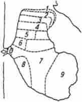 Мал. 13.11. Пошарова топографія сірої речовини спинного мозку по Рекседа. цифрами позначені шари нервових клітин
