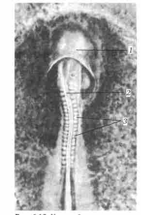 Доступніше і простіше вивчити освіту і будову зародкових оболонок на прикладі зародка курки. На стадії нейрули три зародкових листка безпосередньо переходять від зародка до внеза- родишевой частини, неможливо відмежовуючись. У міру того як зародок набуває форми, навколо нього утворюється кілька складок, які як би Підсікай зародок, відокремлюють його від жовтка і встановлюють чіткі межі між зародком і Позазародкова областями. Вони називаються тулубовими складками (Рис. 6.11).