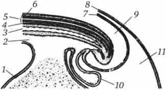 1 - жовтковий мішок, 2 - середня кишка, 3 - аорта, 4 - хорда, 5 - нервова трубка, 6 - ектодерма, 7 - амніон, 8 - хоріон, 9 - порожнина амніону, 10 - аллантоіс, 11 - екзоцелом