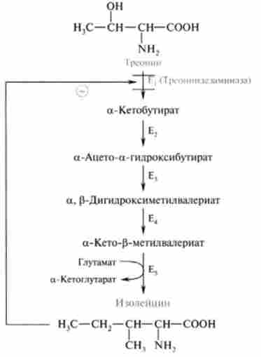Фермент треонінлезаміназа, що каталізує першу необоротну реакцію, відзначено зниження продуктом останньої п'ятої реакції - изолейцином, що виступає в якості високоспецифічного інгібітору, т. Е. Інгібування відбувається за принципом зворотного зв'язку.