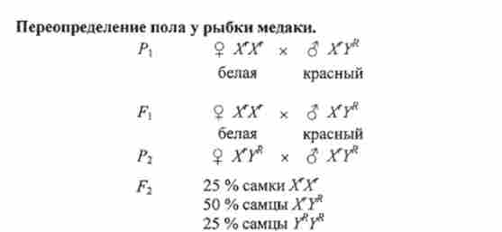 Японський генетик Т. Ямамото в 1953 р провів досліди зі зміни статі у риб під впливом статевих гормонів. У акваріумних рибок Медаком самки мають хромосоми XX, самці - XY. В У-хромосомі знаходиться домінантний ген, що викликає червоне забарвлення тіла R, тому самці різко відрізняються від самок за кольором тіла: самці червоні, самки білі (рецесивний аллель рр).