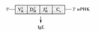 Наприклад, якщо експресується клас А, то вирізують всі фрагменти ДНК, що відповідають класам М, D, G, Е, і утворюється активний фрагмент ДНК, що включає в себе варіабельні гени, а також ген, що кодує константну а-ланцюг. Якщо ж клітина повинна експресувати антитіло, припустимо, класу Е, то під впливом Т-клітин і цитокінів відбувається перемикання класів. Перед кожним геном важких ланцюгів (крім D-класу) є сайт перемикання. При наявності сигналу від Т-клітин або цитокінів ці ділянки рекомбинируют один з одним, а проміжні гени (відповідні ланцюгах Зц, Cs і Су) Вирізаються. Видалення проміжних генів відбувається наступним чином. При отриманні сигналу на перемикання відповідні ділянки рекомбинируют, при цьому утворюється петля ланцюга ДНК, яка вирізається ендонуклеаза. Сайти рекомбінації розташовані в зонах интронов і в результаті сплайсингу також видаляються.