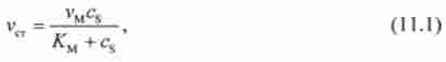 При малих концентраціях субстрату, коли виконується нерівність cs«/ Cm, величиною cs в знаменнику вираження (11.1) можна знехтувати. Залежність стаціонарної швидкості vCT від cs набирає вигляду