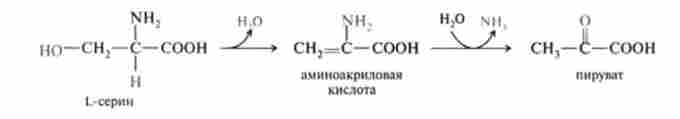 4. Реакції а, р-елімінації, такі, як дегідратація серина, в процесі якої відбувається неокислювального дезаминирование серина і перетворення його в піруват:
