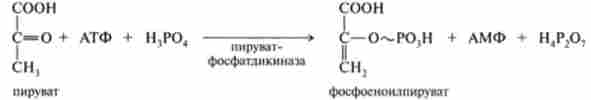 В даній реакції молекула АТФ перетворюється в АМФ і одночасно фосфоріліруст дві молекули: пірувату з утворенням фосфоеноіл бенкеті вата і фосфату з утворенням пірофосфату.