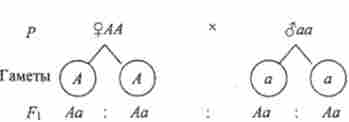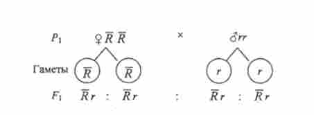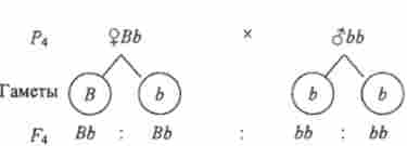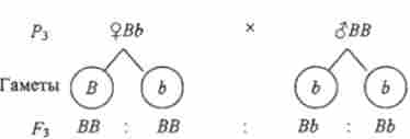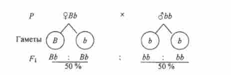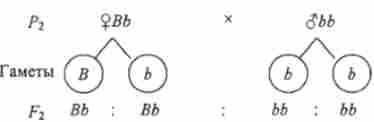 Материнське рослина в цьому схрещуванні утворює гамети двох типів (В і Ь), а батькове - одного типу (В). При злитті таких гамет утворюються гомозиготи і гетерозиготи (1: 1). Все зиготи мають домінантний ген Ву тому все потомство фенотипично одноманітно - з опушеними плодами.