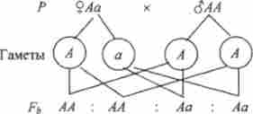 При схрещуванні двох гетерозиготних організмів Аа і Аа, продукують по два типу гамет, в процесі запліднення різновірогідні чотири злиття клітин: АА, Аа, Аа, аа. Імовірність кожного з них - 25%. Залежно від обліковується ознаки, домінантного або рецесивного, можна встановити відсоток ймовірності народження нащадків.