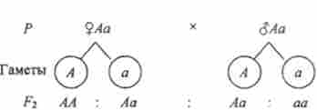 2. Схрещування гетерозиготного організму з гетерозиготних дає розщеплення ознаки в співвідношенні 3: 1 (по генотипу розщеплення 1: 2: 1):