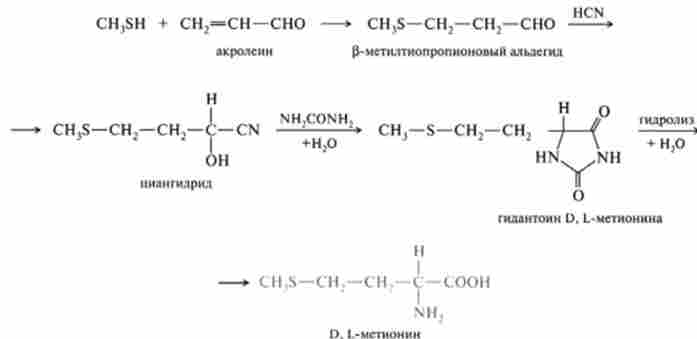А. Штреккером, заснований на реакції альдегіду R-ЗНЗ з ціанідом калію і сечовиною. Отримане циклічне похідне амінокислоти гідролізується лугом з утворенням рацемичної суміші D, L-амінокислоти. Як приклад можна привести отримання L-метіоніну з р-метілтіопропі- онов альдегіду, який, в свою чергу, синтезується з акролеина і метилмеркаптана: