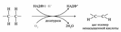 У цьому процесі молекулярний кисень виступає акцептором водню по відношенню до двох донорам водню - жирної кислоти і НАДФН. Реакція каталізується микросомальной десатуразной системою, що складається з цитохрому />5, цитохром ^ -редуктази і оксигенази, за наступною схемою:
