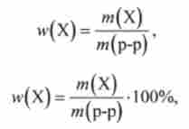 Масова частка w (X) виражається в частках одиниці, відсотках (%), проміле (% о, тисячна частина числа) і в мільйонних частках (млн). Масову частку розраховують за формулами