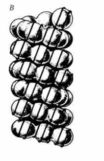 А - з'єднання сусідніх нуклеосом за допомогою гистона HI; Б - ланцюжок, що утворюється нуклеосомами розділеними ділянками ДНК, вільними від білкових тіл; В - можлива модель упаковки ДНК в хроматіно- виття фібрили у вигляді соленоїда