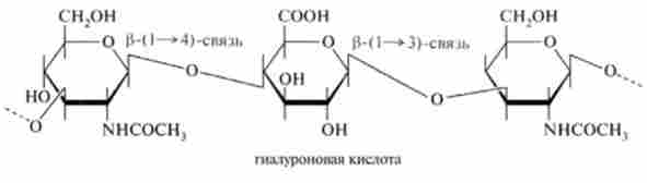 Гіалуронова кислота складається з еквімолярних кількостей D-глюкуроно- вої кислоти і А-ацстіл-О-глюкозаміну, які чергуються один з одним в молекулі полісахариду. Аміноцукор з'єднаний з кислотою (3- (I-> 4) -зв'язком, а кислота - з аміноцукром | 3- (1-> 3) -зв'язком. Таким чином, гіалуронова кислота має наступну структуру: