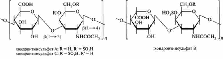 Хондроітінсульфати. До них відноситься, зокрема, хондроїтин - полісахарид, подібний до гіалуровой кислотою, в якому D-глюкозамін замішаний D-галактозамін, є вихідним з'єднанням для трьох полісахаридів, широко поширених в якості компонентів сполучної тканини, а саме для хондроітінсульфатов А, В і С . Ці три речовини мають наступну структуру:
