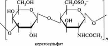 Кератосульфати. Вони схожі з хондроітінсульфата як в структурному відношенні, так і за своїм поширенням. Кератосульфат є одним з головних полісахаридів сполучної тканини; крім того, він зустрічається і в деяких інших тканинах. Кератосульфат складається з чергуються залишків D-галактози і УУ-ацетил-О-глюкозамін-сульфату, з'єднаних між собою чергуються зв'язками р- (1 * 4) - і р- (1 -? 3)-типу.
