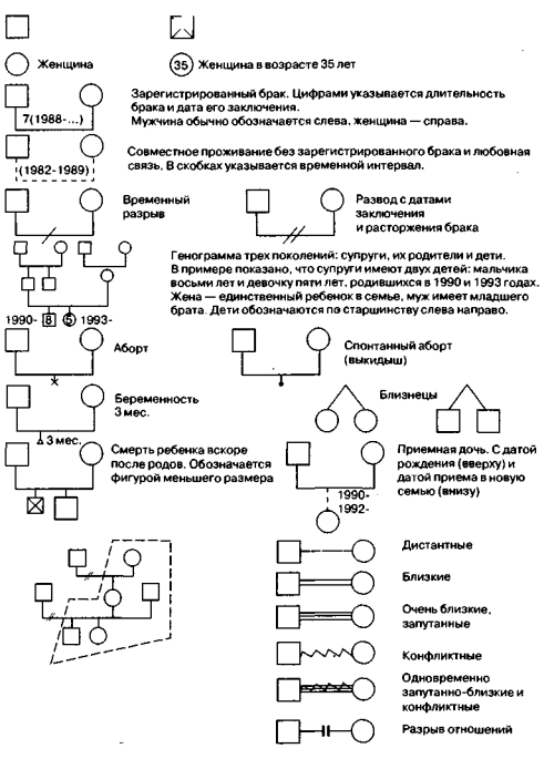 У системному підході можна об'єднати одночасно поточний і історичний контекст родини. «Перебіг тривоги» в сімейній системі відбувається як уздовж вертикального, так і вздовж горизонтального напрямків. «Вертикальний» потік походить від патернів функціонування та взаємовідносин, що історично переходять вниз по поколінням, головним чином через процес емоційного тріангулірованія. «Горизонтальний» потік виникає з поточних стресів сім'ї, двигающейся через час, спроб впоратися з генограмму СІМ'Ї. ОСНОВНІ ПОЗНАЧЕННЯ На генограмму поруч з тими особами, до яких це стосується, можуть коротко позначатимуться їх імена, освіта, рід занять, серйозні захворювання, місце проживання і т. д. 1943-1975 Чоловік \ 7 Померлий чоловік з датами народження і смерті