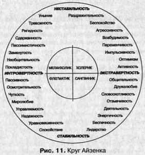 Зв'язок факторно-аналітичного опису особистості з чотирма класичними типами темпераменту - холеричним, сангвінічним, флегматичним, меланхолійним відображається в «колі Айзенка»: по горизонталі в напрямку зліва направо - збільшується абсолютна величина показника екстраверсії, а по вертикалі знизу вгору - зменшується вираженість показника стабільності.