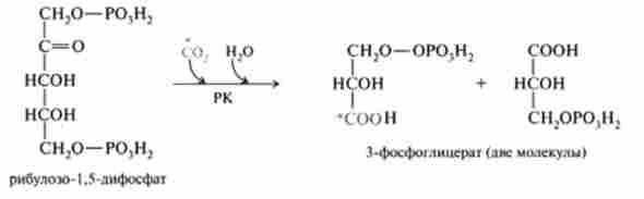 Центральної реакцією, що забезпечує перехід С02 в органічну форму, є реакція карбоксилирования і одночасного розщеплення рибулозо-1,5-дифосфата з утворенням двох молекул 3-фосфогліцерата (ЗФГ), яка каталізується ферментом рибулозо-1,5-діфосфаткарбоксілазой (РК):