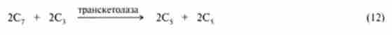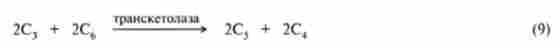 Реакції (2) - (8) циклу Кальвіна збігаються з такими в процесі глю- конеогенеза в тварин тканинах (гл. 20), за винятком того, що донором відновних еквівалентів в реакції (3) виступає НАДФН, а не НАДН. В ході цих реакцій 6 молекул С02 включаються в глюкозу. Реакції (9) - (14) спрямовані на регенерацію 6 молекул рибулозо-1,5-ліфосфата, який необхідний для того, щоб міг розпочатися новий оборот циклу Кальвіна. Цей процес досить складний і включає реакції, що каталізуються ферментом гліколізу альдолазой і ферментами пентозофосфатного шляху окислення глюкози транскетолази, епімерази і ізомерази. Хімізм реакцій наведено в гл. 18, схематично їх можна описати таким чином: