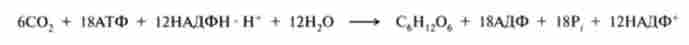 Таким чином, шість молекул С02 - це еквівалент однієї молекули глюкози, і, отже, на кожну асимілювати молекулу С02 витрачається три молекули АТФ і шість молекул НАДФН.