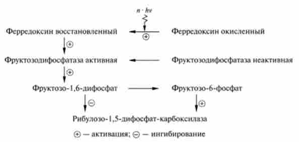 Регуляція темновой стадії фотосинтезу. Регуляторним ферментом перетворення С02 в вуглеводи є перший фермент циклу Кальвіна - ри- булозо-1,5-діфосфаткарбоксілаза. При регуляції по аллостерічному механізму інгібітором ферменту є один з центральних метаболітів циклу Кальвіна - фруктозо-1,6-дифосфат, а активатором - фруктозо-6-Фос фат. У свою чергу, обидва ефекту пов'язані з активацією циклу Кальвіна при дії квантів світла за схемою: