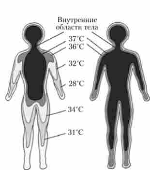 У різних ділянках тіла людини температура не однакова. Розподіл внутрішньої температури в різних тканинах залежить від перенесення тепла кров'ю при її циркуляції, місцевих змін температури в результаті обмінних процесів в працюючих м'язах, внутрішніх органах (серце і ін.), А також в мозку. Тепло, що утворюється в глибоких областях тіла, називається внутрішнім. Воно переходить до поверхні тіла. В цілому температура поверхні тіла визначається теплом, що приходять з глибини організму, і температурою навколишнього середовища. Таким чином, температура тіла складається з відносно постійною внутрішньої температури і деякої зовнішньої температурної «оболонки» тіла, ізолюючої її від зовнішнього середовища (рис. 15.1). Зазвичай в холодному середовищі приплив крові до поверхні скорочується, що викликає зменшення температури «оболонки» тіла (рис. 15.1, а). Якщо температура навколишнього середовища висока, це ускладнює тепловіддачу і зовнішня температура тіла наближається до внутрішньої (рис. 15.1, б).