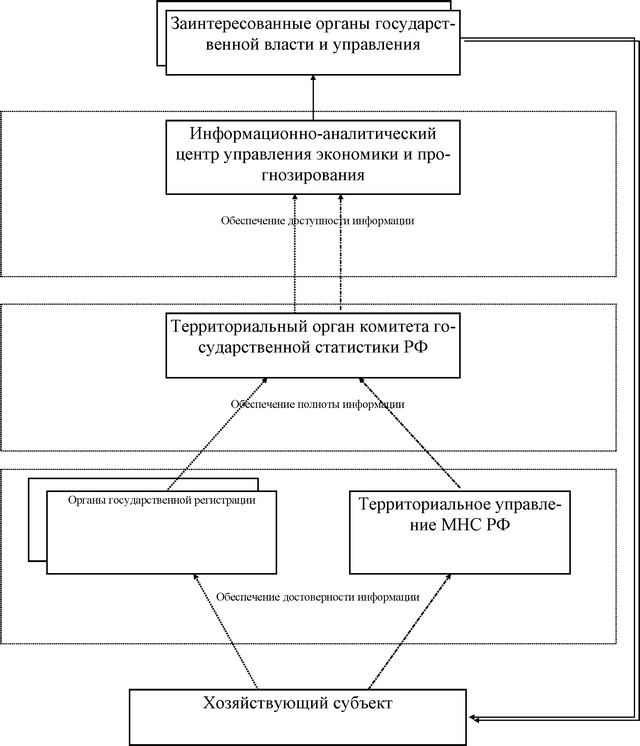 Рис. 3 Схема інформаційної взаємодії в рамках реєстру господарюючих суб'єктів регіону система організаційної взаємодії при проведенні обліку господарюючих суб'єктів (рис. 4) Подібний підхід до організації обліку господарюючих суб'єктів дозволяє: по-перше, створити інтегрований в масштабах регіону реєстр господарюючих суб'єктів, наповнений економічно змістовною інформацією; - по-друге, уникнути дублювання окремих функцій органів державної влади і управління , а також органів місцевого самоврядування щодо збору та обробки інформації; - по-третє, оптимально вирішити питання, пов'язані з виконанням вимог, що пред'являються до інформаційної бази регіонального економічного моніторингу.