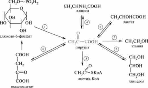 У процесі гліколізу молекула глюкозо-6-фосфату перетворюється в дві молекули пірувату, останній в анаеробних умовах відновлюється до лактату. Третя важлива реакція - окислювальне декарбоксилювання пірувату, яке завершується утворенням ацетил-КоА (С2-фрагмент), який потім втягується в цикл трикарбонових кислот. Через реакцію трансаміні- вання піруват пов'язаний з амінокислотами, а при окисленні гліцерину (метаболіт ліпідів) утворюються тріози (3-фосфогліцеріновий альдегід або 3-Фос
