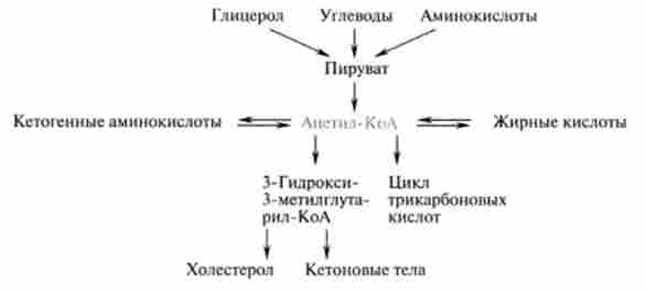 Через ацетил-КоА перекидається місток від моносахаридів і амінокислот до ліпідів. Основним джерелом ацетил-КоА є окисне декарбоксилювання пірувату і р-окислення жирних кислот.