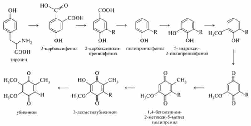 Добре вивчені шляхи синтезу убихинона з тирозину в тваринних клітинах. З тирозину в результаті ряду перетворень отримують такі сполуки: