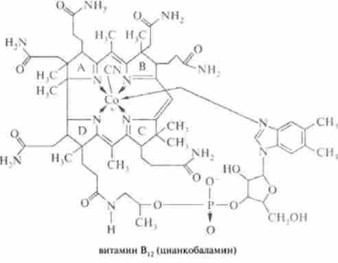 Ціанкобаламін представляють собою групу речовин, що володіють активністю вітаміну Bl2. Вперше цей вітамін був отриманий в кристалічному стані в 1948 р Е. Рікетса і Е. Смітом. Кристали його темно-червоного кольору, добре розчинні у воді і нерозчинні в органічних розчинниках. Вітамін В,2 чутливий до дії світла, при світловому впливі цианкобаламин перетворюється в оксикобаламин. З усіх відомих вітамінів цианкобаламин має найскладнішу хімічну структуру: