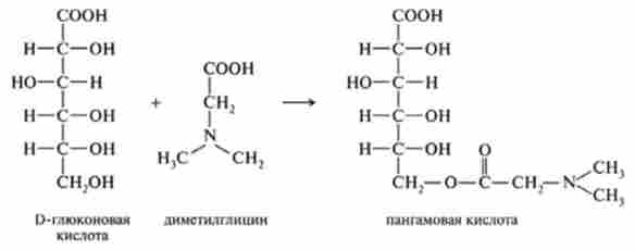 Є кілька способів синтезу пангамовой кислоти. Найбільш простий з них полягає у взаємодії D-глюконової кислоти і Диметилгліцин з утворенням кінцевого продукту: