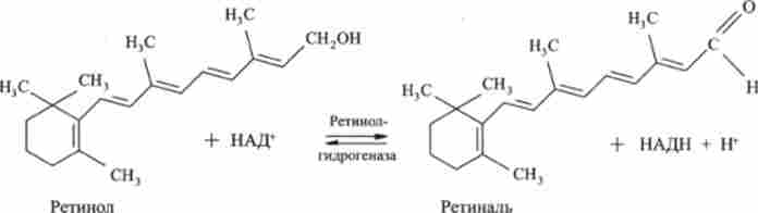 Вітаміни групи А легко окислюються як в лабораторних умовах (за допомогою МПНВ), так і в організмі. Окислюючись в організмі за участю ретінолде- гідрогенази, ретинол (спирт) перетворюється в ретиналь (альдегід), теж володіє активністю вітаміну А: