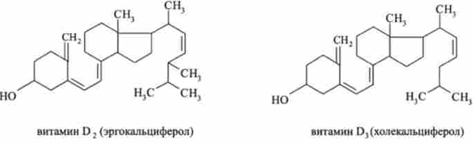 Найбільш поширені вітаміни D2 і D3. Провітамінами D2 і D3 є відповідно ергостерол і холестерол (холестерин). Вони переходять в активну форму в результаті розмикання кільця В під дією сонячного світла. Отже, при наявності відповідних провитаминов (наприклад, 7 дегідрохолестерол у людини) вітамін D3 може синтезуватися в організмі і його надходження з їжею не обов'язково.